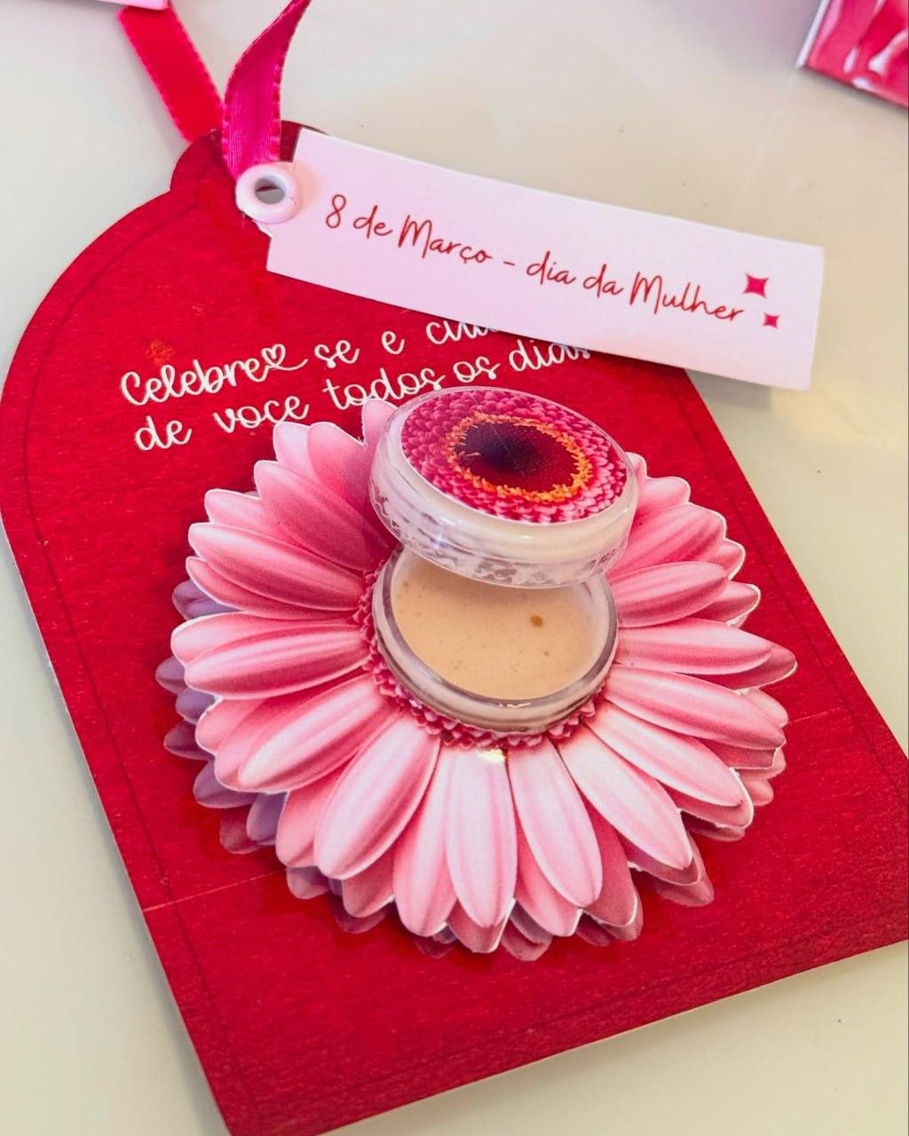 Personalização em papel de alta qualidade, com flor com efeito em camada e um mini recipiente com creme hidratante.