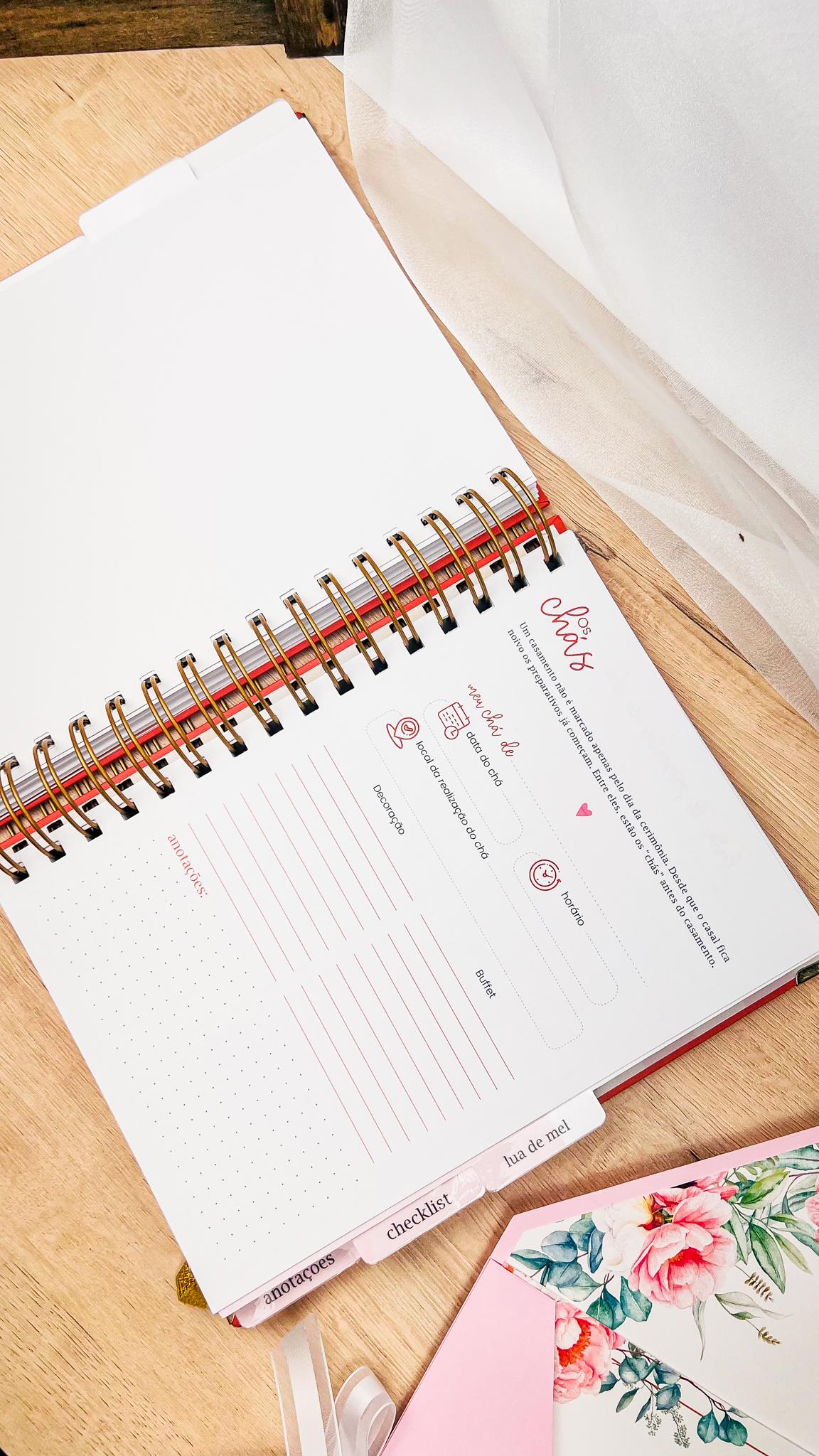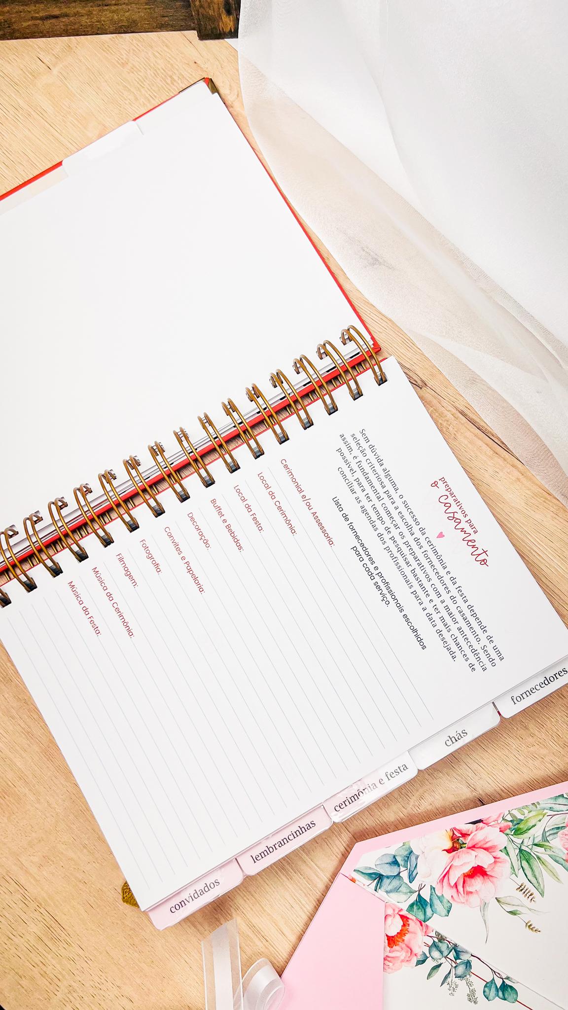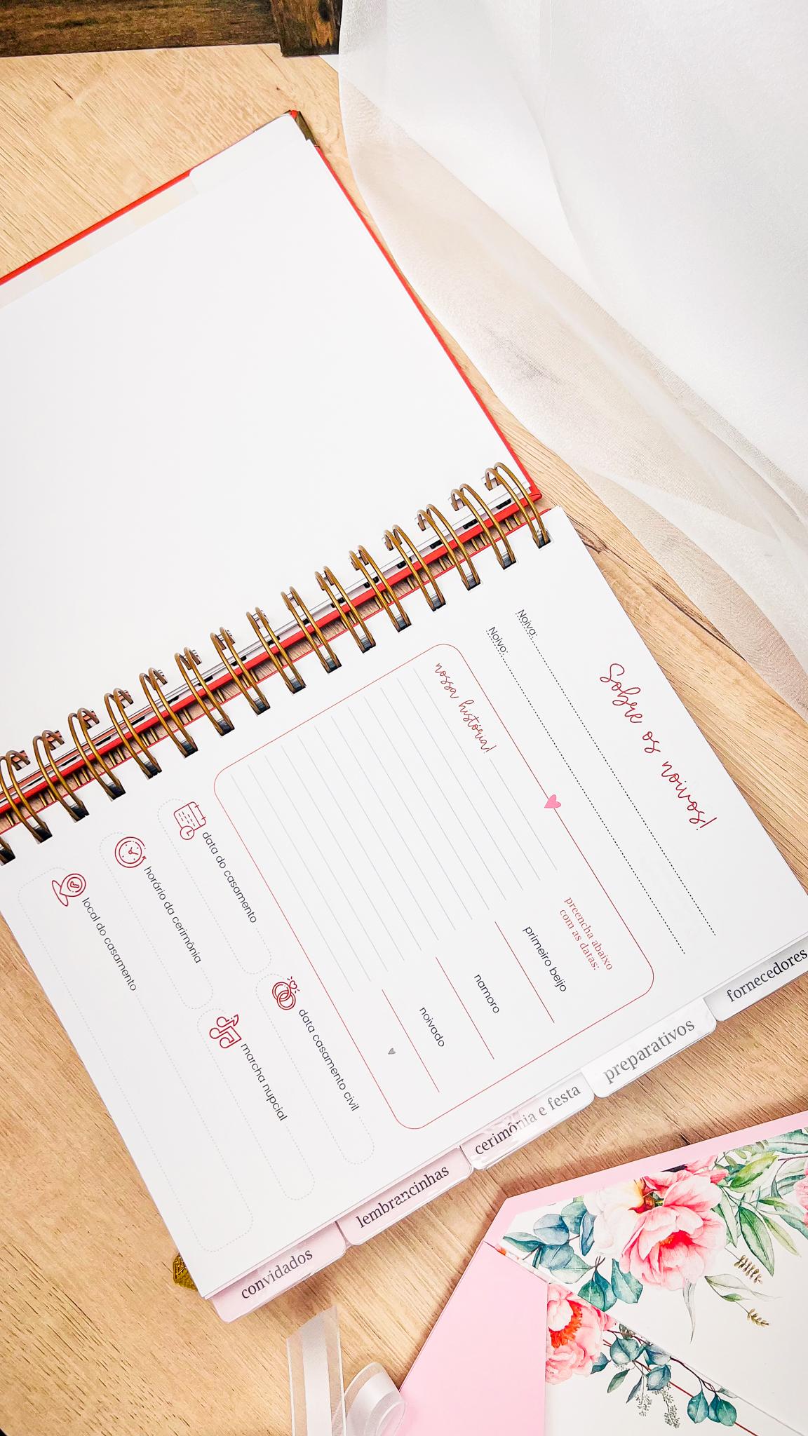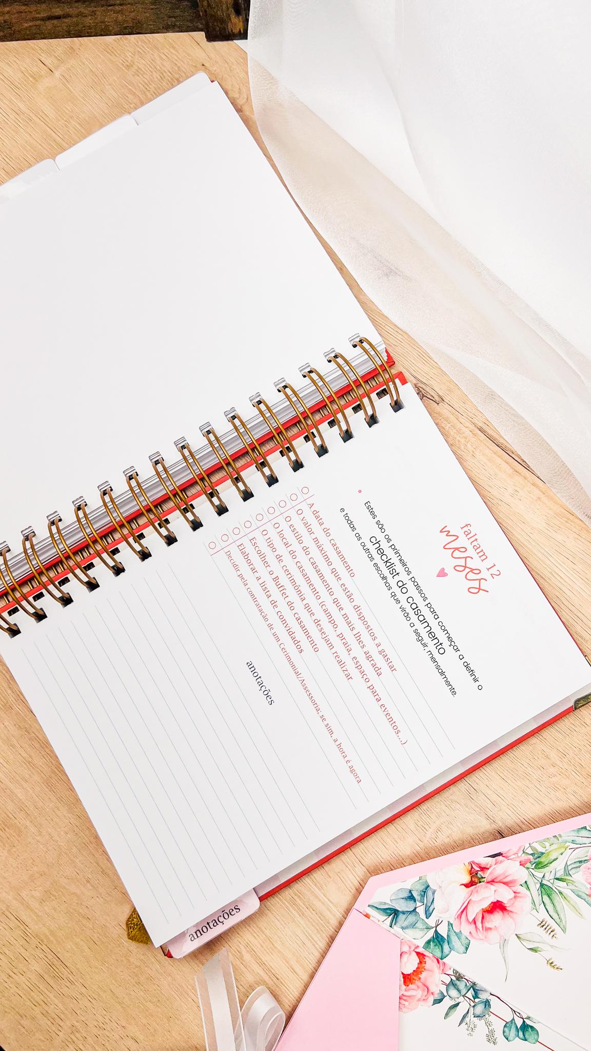- Espaço para planejamento dos últimos 12 meses que antecedem o casamento, com checklist de atividades