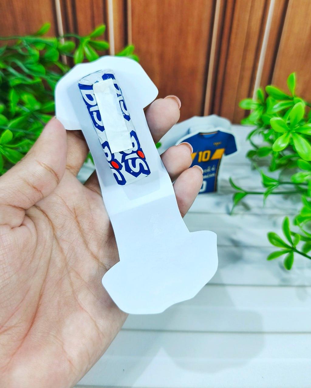 Contém card no formato de camisa, chocolate ao leite ou branco e embalagem individual.