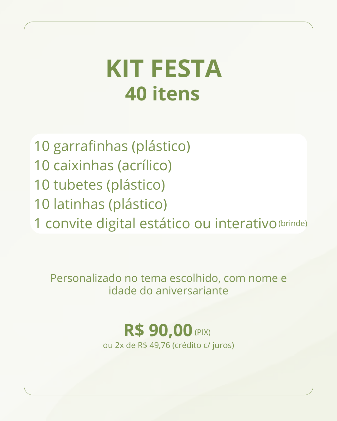 Transforme qualquer festa em um momento único com nosso kit festa personalizada! Esse kit traz peças decorativas que deixam a mesa ainda mais charmosa e cheia de personalidade. Cada detalhe é pensado para encantar os convidados e criar uma atmosfera alegre e inesquecível.