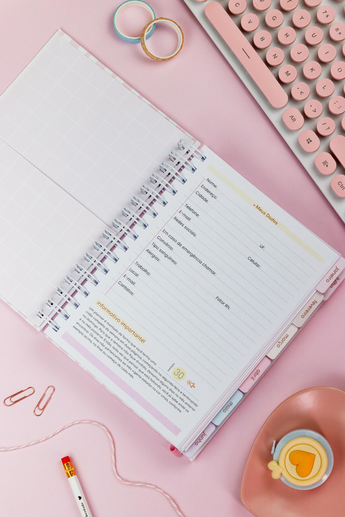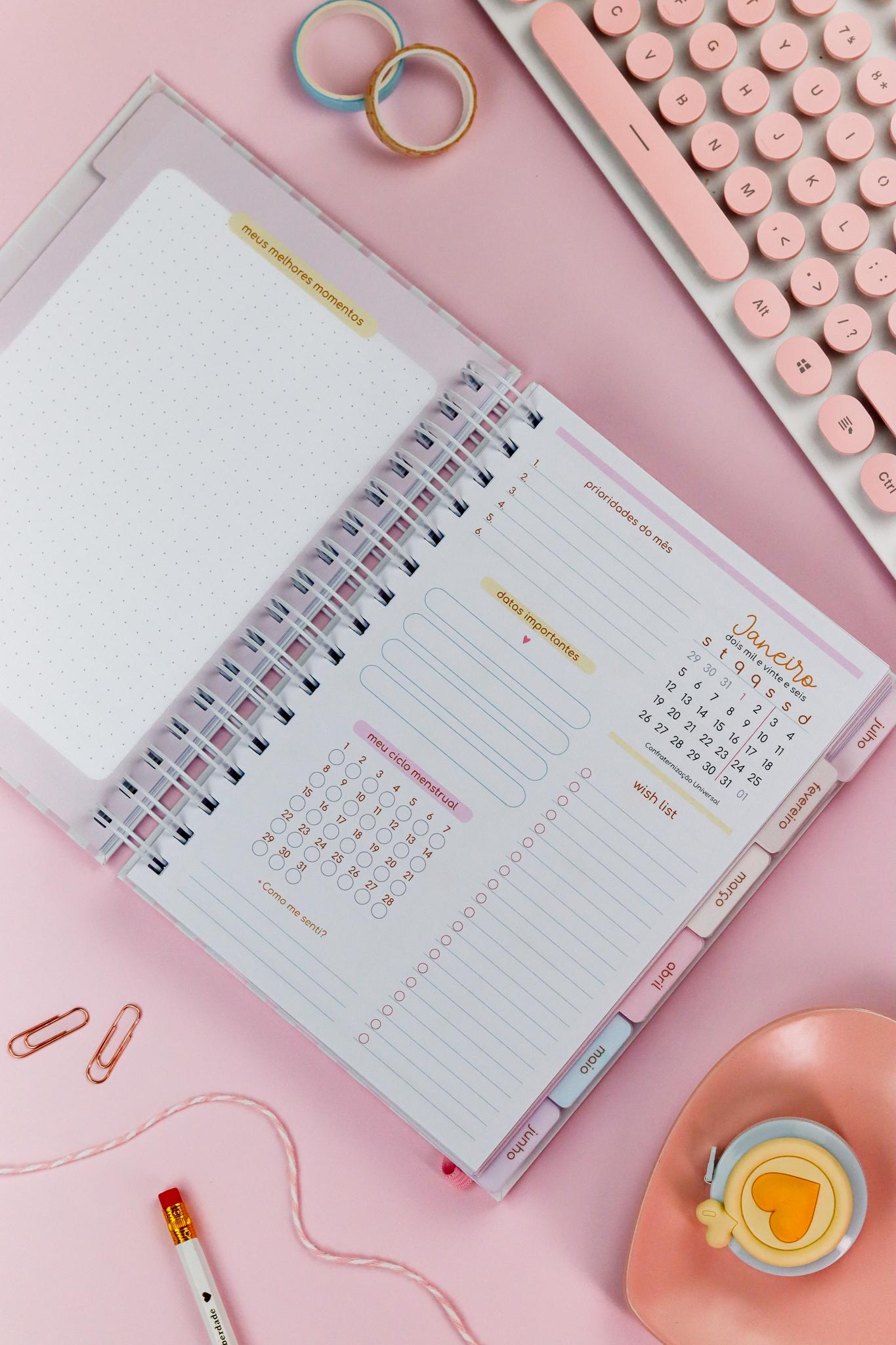Contatos uteis, Lista telefônica, Planejamento anual, Meu ano em pixels, Controle de saúde, Visão financeira do ano, Controle de logins, senhas e PIX, Contas bancárias;
