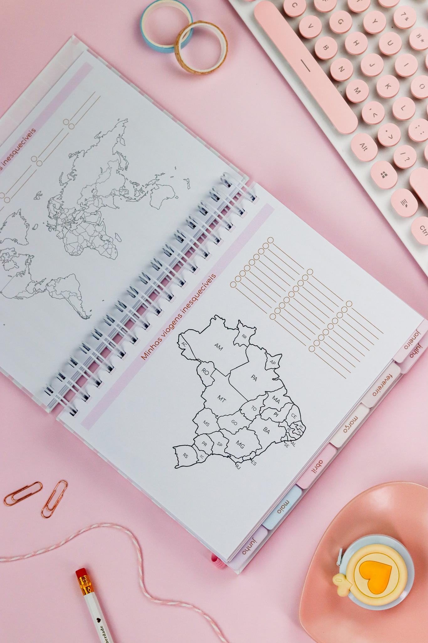 Lista de Séries e  Livros, Mapa Mundi e do Brasil para colorir conforme viagens, Folha de anotações importantes, Visão mensal;