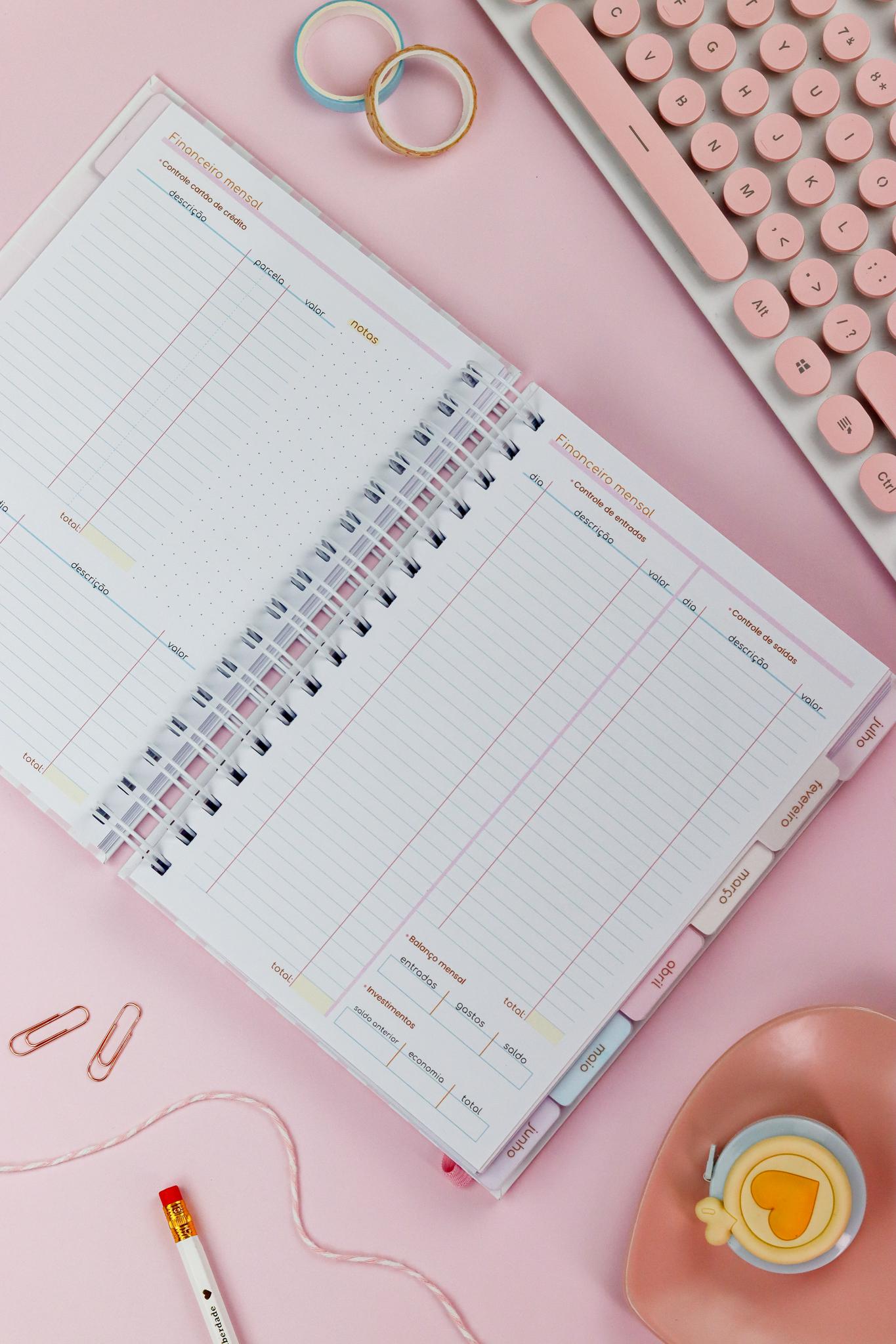 Controle financeiro mensal em duas páginas;