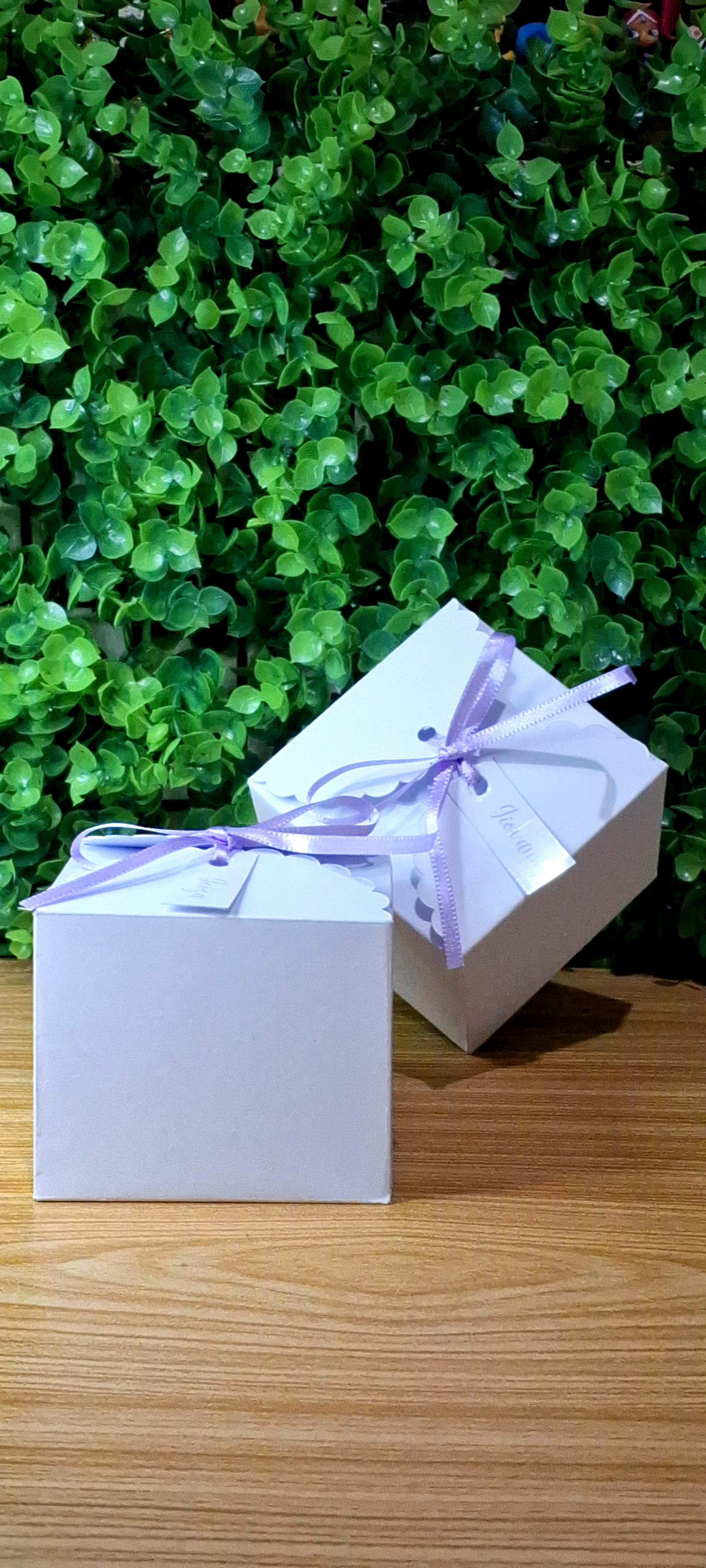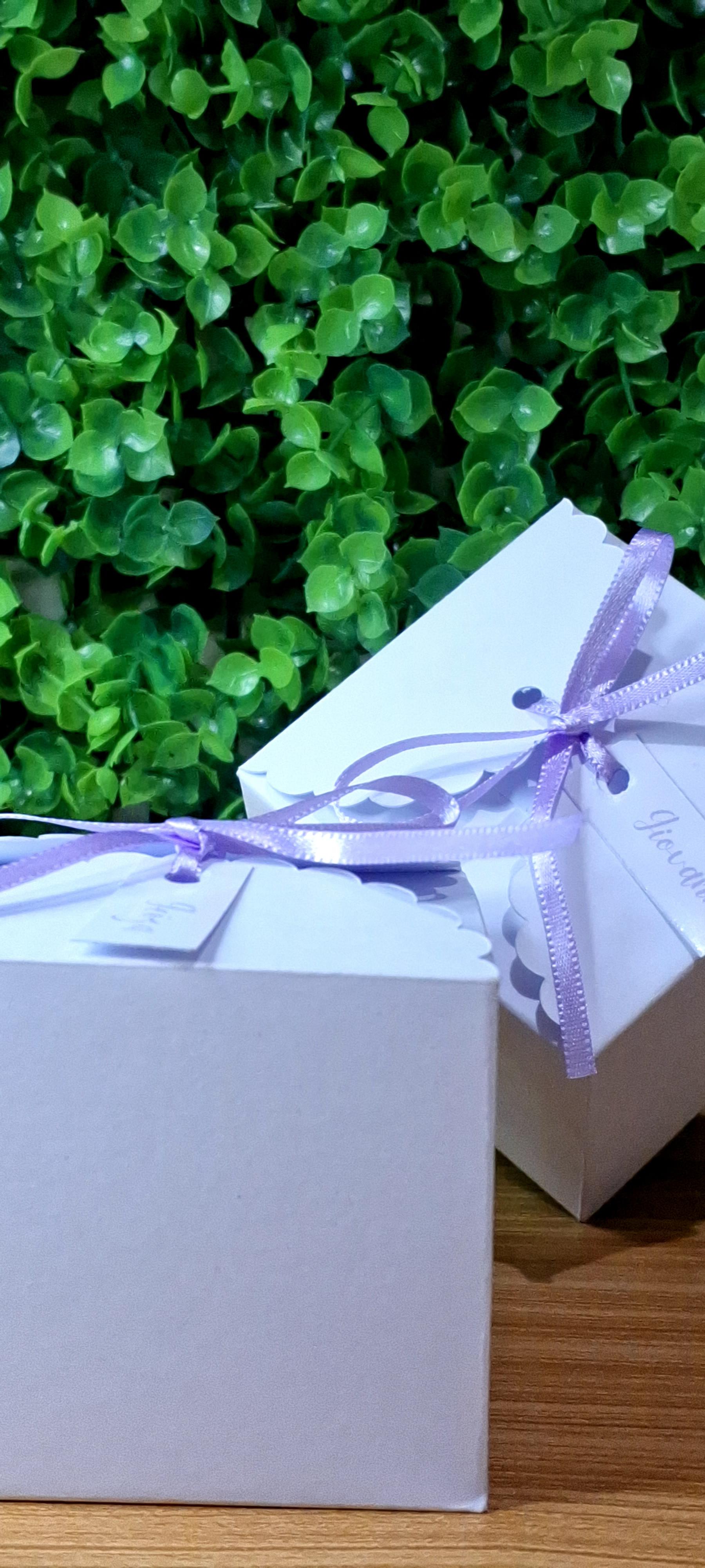 Acabamento: Corte ondulado na aba com perfuração para fita, e fita de cetim.