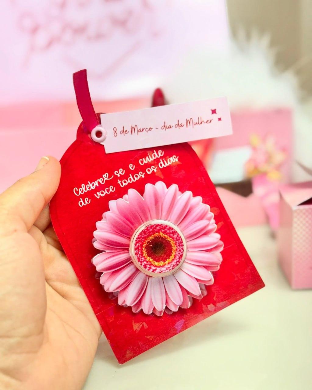 Personalização em papel de alta qualidade, com flor com efeito em camada e um mini recipiente com creme hidratante.
